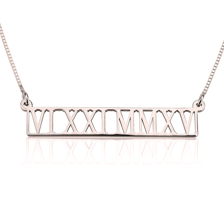 The roman numeral bar necklace is the perfect gift to commemorate that special date. Hangs beautifully on a box chain in the length of your choice. The pendant measures 43mm x 8mm / 1.7" x 0.3" and 1.1 mm / 0.04" thickness. Available in .925 shiny sterling silver, 24k gold plated (gold over sterling silver) or rose gold plated.